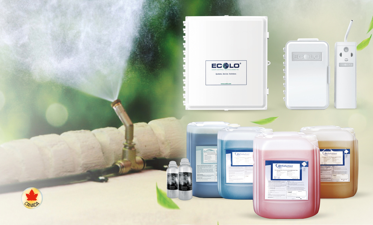 加拿大ECOLO異味控制技術的核心是從幾百種天然植物中提取植物成分,經科學配比,配制成可以去除不同異味的、多種型號的植物提取液。配套的霧化系統,將天然植物液霧化成粒徑很小的霧狀顆粒,霧滴具有很大的比表面積,可以有效吸收空氣中的惡臭分子,被吸附的惡臭分子,能與植物液中的酸性緩沖液發生反應,從而去除異味。